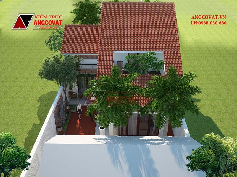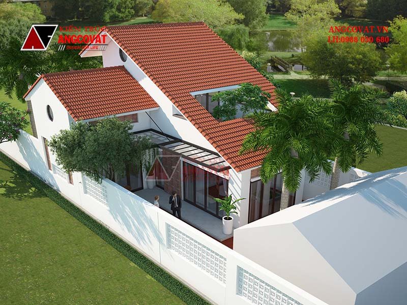 Điểm nhìn từ bên hông và phía sau nhà. Kiến trúc được thiết kế theo kiểu mái thái, kiểu mái thái đẹp đã rất quen thuộc với nhiều người. Trong đó chúng tôi cũng đã thiết kế thêm nhiều cửa để tạo sự thông thoáng.