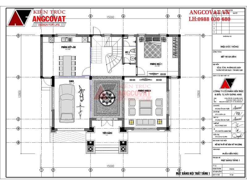 Toàn bộ diện tích sàn tầng 1 của mẫu thiết kế nhà biệt thự 3 tầng mái thái 150m2 mặt tiền 15m 4 tỷ đồng là không gian sinh hoạt chung và đón tiếp khách khứa của gia đình. Từ cầu thang ngoài trời dẫn lên tầng 1,bạn sẽ bước qua khu vực đại sảnh và bước chân vào sảnh trung tâm của ngôi nhà. Sảnh trung tâm sẽ là nơi nghỉ chân ngắm cảnh của các vị khách trước khi đặt chân vào phòng khách hay sang bếp ăn. Đây được coi như là điểm dừng, bởi vậy yêu cầu đặt ra đối với kiến trúc sư là phải tạo được ấn tượng và sự thoáng đãng cho không gian này. Sự ấn tượng được tạo ra nhờ thiết kế đèn chùm sang trọng với ánh sáng vàng, sàn nhà lát đá hoa cương sang trọng, các chi tiết phào chỉ tinh tế làm nổi bật mảng tường trần,...