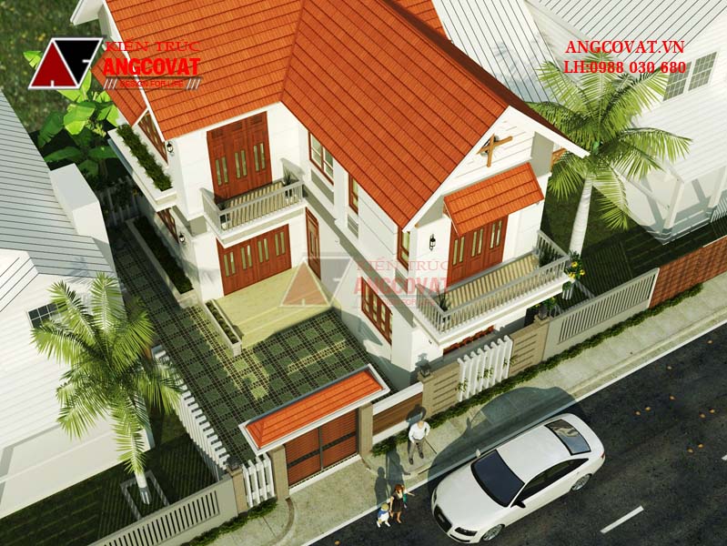 Biệt thự 2 tầng hiện đại diện tích 70m2 có diện tích thực là 65m2. Ngôi nhà này được thiết kế theo hình dạng chữ L với phong cách kiến trúc đồng quê truyền thống. Phần mái được thiết kế màu cam tươi mới tạo cảm giác tràn đầy sức sống, nổi bật và tinh tế. Mẫu biệt thự 2 tầng này, các kiến trúc sư Angcovat đã phối hợp khéo léo các tone màu từ màu ngoại thất trắng đến thiết kế cửa gỗ tươi, cổng nhà cùng các chi tiết trang trí ngoại thất bắt mắt. Không gian thiết kế công năng tầng 1 bao gồm sảnh chính, phòng khách, 1 phòng ngủ nhỏ, 1 phòng bếp ăn và nhà vệ sinh với các diện tích cụ thể như sau Phòng khách (28m2), Tiền sảnh (8.5m2), Phòng ngủ 1: (14m2), WC1: (3.3m2). Tầng 2 được thiết kế: Phòng ngủ 2: (14m2), Phòng ngủ 3: (14m2), Phòng thờ: (12.5m2), WC2: (3.3m2), với chiều cao tầng: Tầng 1 - 3,6(m), Tầng 2 - 7,1(m), Mái - 9,6(m).