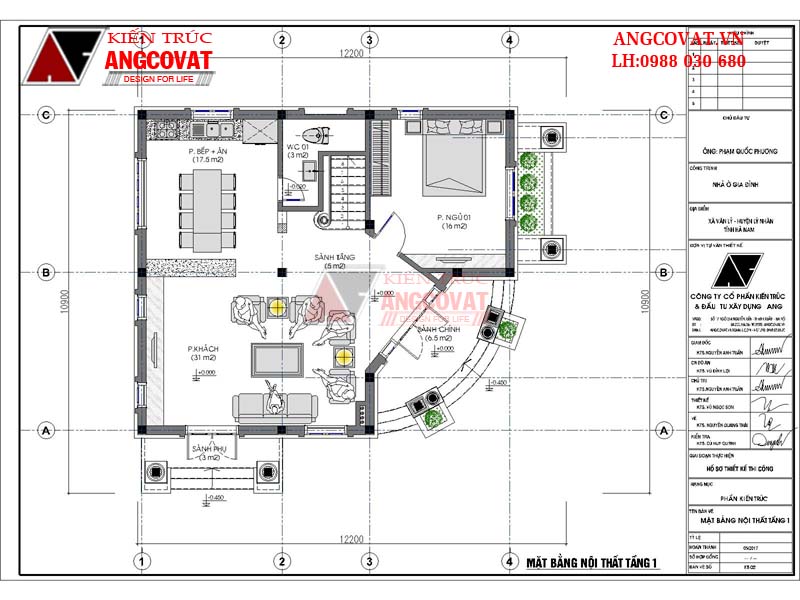 + Tầng 1: Phòng khách (31m2), Phòng bếp + ăn (17.5m2), Phòng ngủ 1( 16m2), WC 1 (3m2), Sảnh chính (6.5m2), Sảnh phụ (3m2)