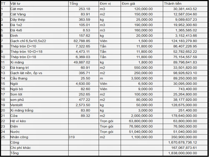 Bảng dự trù kinh phí cho mẫu thiết kế nhà 2 tầng 1 tum