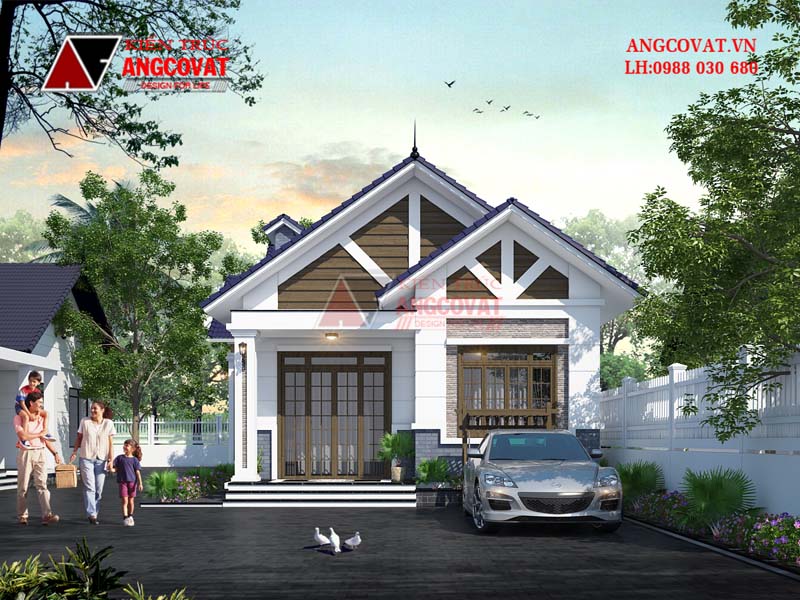 Dưới con mắt thẩm mỹ của các kiến trúc sư, tông màu trắng và xám nâu vàng nhẹ được kết hợp khá ăn ý cùng nhau bao phủ khắp những khối tường của mẫu nhà cấp 4 1 tầng đẹp. Màu trắng được điểm tô tại các khối trụ tường và phần trên gần mái nhà, màu nâu vàng được tô điểm tại các mảng trang trí đầu hồi, màu khung cửa của ngôi nhà tạo sự phối hợp tổng thể thêm hài hòa và hút mắt người nhìn.