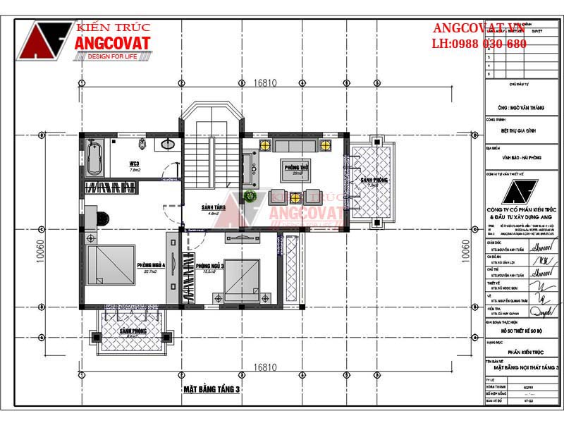 Nội thất tầng 3 mặt bằng biệt thự 150m2 mặt tiền 10x16m