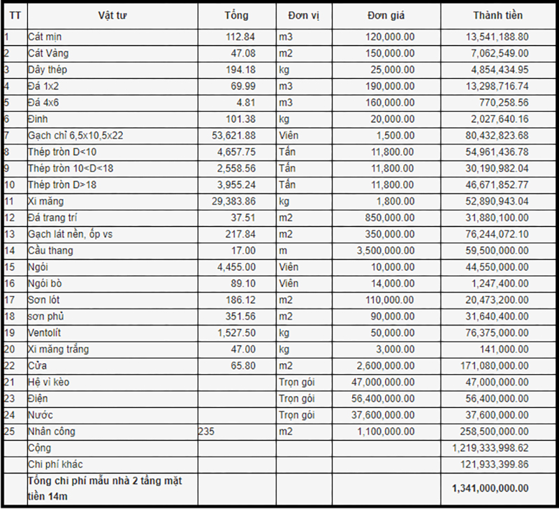 * Đơn giá trung bình xây dựng cho mẫu thiết kế nhà 2 tầng 4 phòng ngủ 1 phòng thờ mặt tiền 14m mái thái là: 5,706,000 triệu/m2