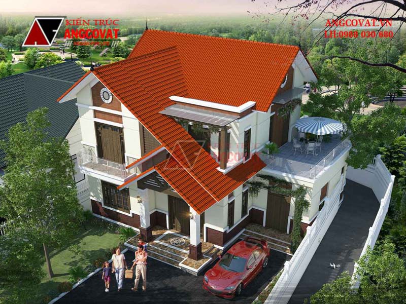 Phối cảnh mái thái trong mẫu thiết kế nhà 2 tầng 4 phòng ngủ 1 phòng thờ
