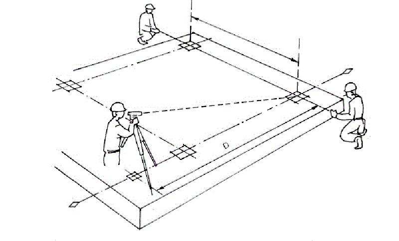 Làm công trình lớn cần có người chuyên làm trắc đạc và nên dùng máy toàn đạc điện tử thay vì giác móng bằng thủ công chính xác. Máy quang có sai số lớn, bẻ góc 90 công trình dài >30m là sai số vài cm.