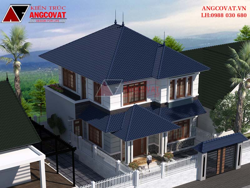 Nhà mái thái ngói xanh dược khá nhiều gia đình yêu thích và mẫu thiết kế nha dep 2 tang 100m2 3 phòng ngủ cũng không phải trường hợp ngoại lệ. Màu xanh không những tạo cảm giác thanh mát, trầm ổn mà còn mang lại sự an yên cho mọi người. Màu xanh vừa ẩn chứa điều gì đó hiện đại, mới mẻ, lại pha chút cổ điển, lãng mạn, phù hợp với cảnh quan xanh mát xung quanh.