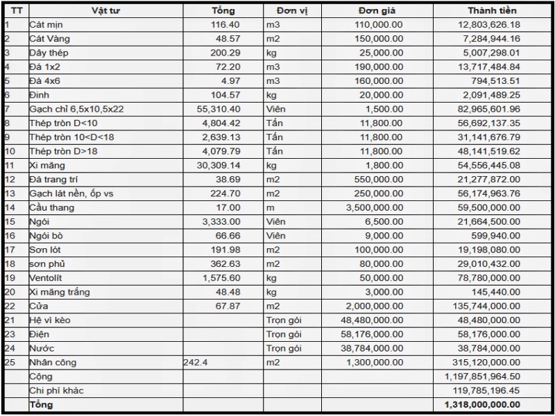 * Trường hợp đổ bê tông mái bằng và mái dốc, chi phí là: 1.449.800.000.000