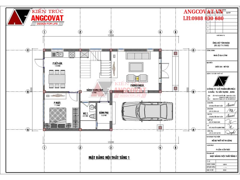 Không gian sử dụng của tầng 1 bao gồm các phòng chức năng như sau: Tầng 1: Phòng khách: 17.7m2, Sảnh trung tâm: 6.5m2, Phòng bếp ăn: 13.5m2, Phòng ngủ: 11.5m2, WC1: 4.5m2, Sảnh phụ 3.2m2