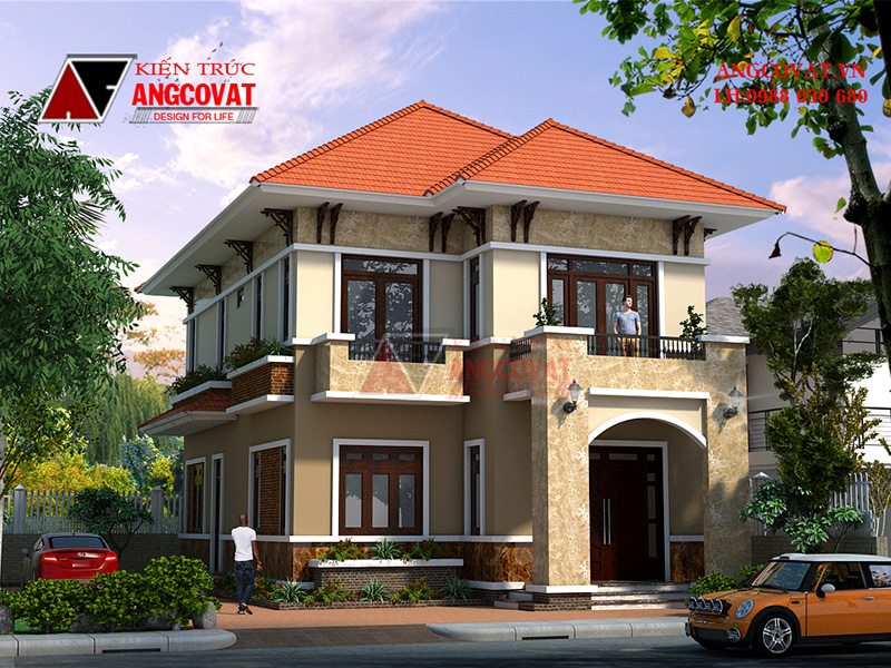 Mẫu nhà 2 tầng 100m2 trên đây được thiết kế theo phong cách kiến trúc tân cổ, thể hiện qua hình khối và màu sắc mà kiến trúc sư đã sử dụng. Phong cách kiến trúc tân cổ điển được nhiều gia đình ưa thích và lựa chọn bởi vẻ đẹp hoài cổ nhưng vẫn đảm bảo sự sang trọng, tân tiến. Mặt tiền của ngôi nhà 2 tầng trên đây nổi bật với tone màu vàng nhạt kết hợp sắc nâu nạt tạo nên sự độc đáo, mới lạ cho ngôi nhà của gia đình bạn. Trong hình khối, chúng tôi vẫn lấy sự cân đối, vuông vắn là trọng tâm để tạo nên sự nổi bật cho ngôi nhà 2 tầng kiến trúc tân cổ này. Kiến trúc mái thái được sử dụng cho ngôi nhà nhằm tạo nên sự kiên cố, vững trãi và giúp bảo vệ ngôi nhà tránh khỏi các tác động tiêu cực của tự nhiên. Mái ngói thái với màu đỏ tươi càng làm cho ngôi nhà nổi bật hơn giữa thiên nhiên xung quanh.