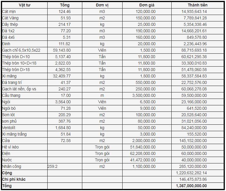 + Trường hợp đổ bê tông mái bằng và mái dốc, chi phí là: 1.589.500.000,00