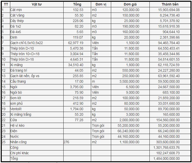 + Trường hợp đổ bê tông mái bằng và mái dốc, chi phí là: 1.444.300.000,00