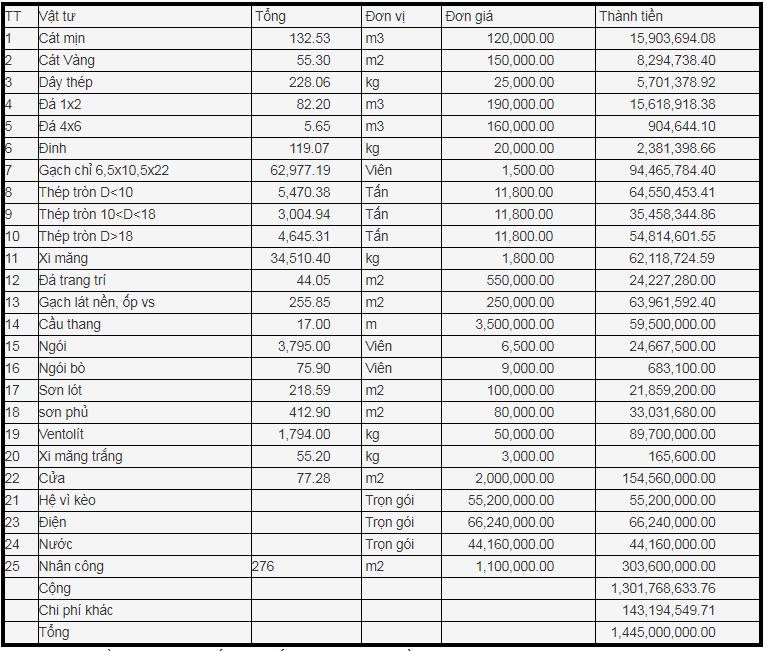 * Trường hợp đổ bê tông mái bằng và mái dốc chi phí là: 1.449.800.000.00
