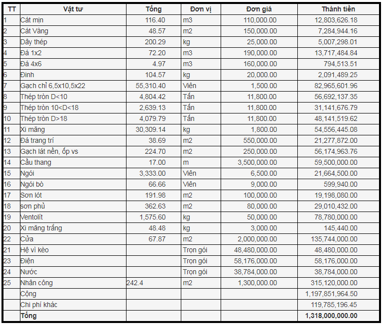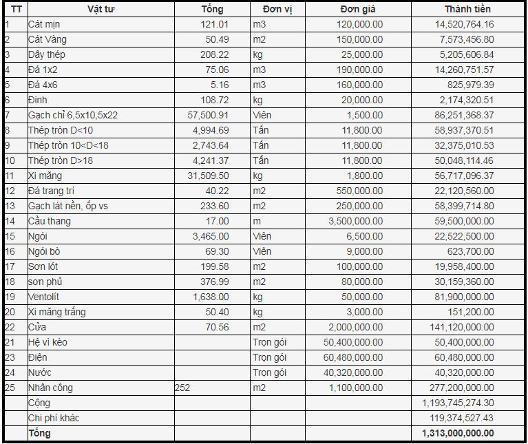 Tham khảo chi tiết bảng tính vật tư công trình để trả lời câu hỏi xây nhà 2 tầng hết bao nhiêu tiền