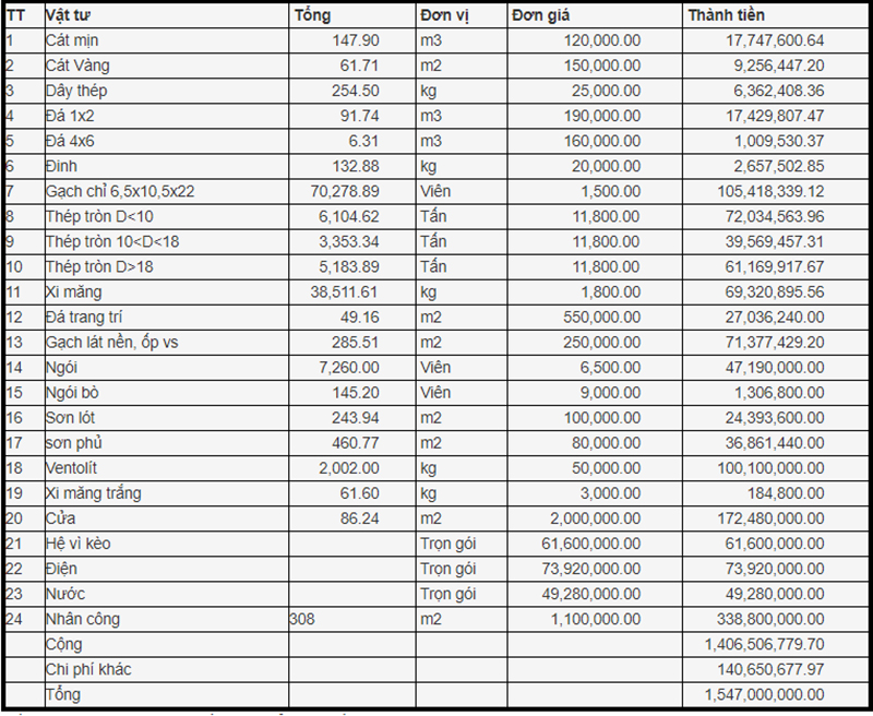 * Trường hợp đổ bê tông mái bằng và mái dốc, chi phí là: 1,701,700,000 đồng