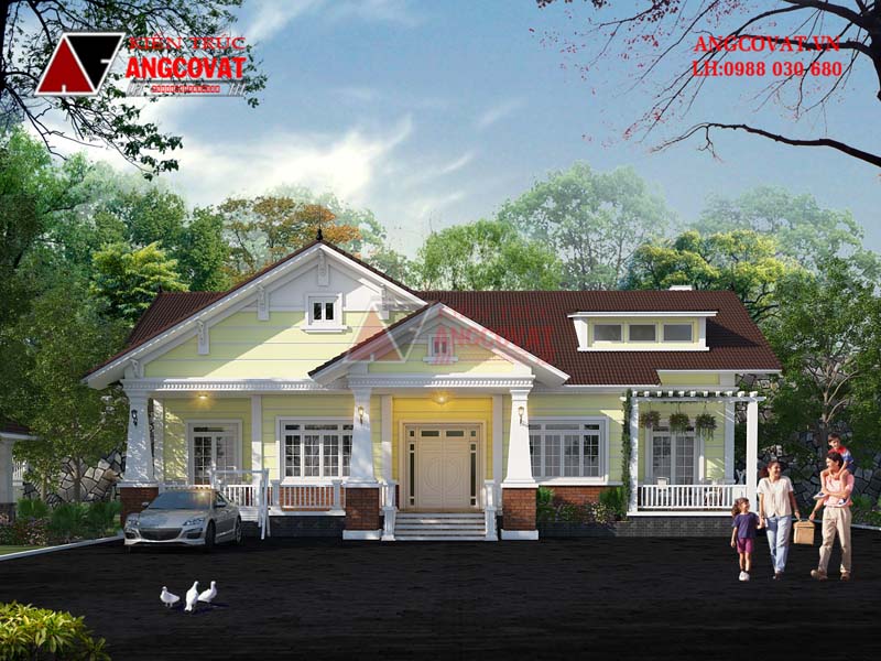 Cũng giống như một bức tranh, người họa sĩ chỉ vẽ những nét vẽ lên giấy thì nó chỉ là những nét vẽ đen trắng vô hồn. Chỉ khi người họa sĩ phối màu thì bức tranh mới thực sự ấn tượng, sống động. Một ngôi nhà cũng vậy, người kĩ sư muốn thực sự thổi hồn vào “đứa con tinh thần” của mình thì phối màu quả thực là một khâu không thể thiếu. Đối với thiết kế nhà đẹp 1 tầng phong cách Châu Âu này, kiến trúc sư của Angcovat đã rất tâm huyết trong việc lựa chọn và phối màu. Màu sắc chủ đạo của ngôi nhà đẹp1 tầng phong cách Châu Âu đó là màu vàng chanh. Với màu vàng chanh, ngôi nhà vừa không bị quá chói hay quá trầm. Màu vàng chanh còn được kết hợp tinh tế, khéo léo với màu trắng cổ điển. Màu trắng mang đến một vẻ đẹp tinh khôi, sang trọng, tinh tế cho ngôi nhà. Bởi vậy mà trong những thiết kế lâu đài cổ Châu Âu người ta thường dùng màu trắng làm màu chủ đạo. Màu trắng và màu vàng chanh kết hợp với nhau giữa một không gian đồng quê như nhà anh Hùng sẽ mang đến một không gian tuyệt vời, ngôi nhà đẹp một tầng phong cách Châu Âu sẽ hài hòa với không gian cây xanh xung quanh. Với mỗi khách hàng của chúng tôi, do mỗi người có một mệnh khác nhau, mệnh sẽ phù hợp với những màu sắc cũng khác nhau. Bởi vậy chúng tôi luôn tôn trọng ý kiến khách hàng và mang đến cho khách hàng một lựa chọn hoàn hảo phù hợp với mệnh cũng như sở thích của họ. Không chỉ có mẫu nhà đẹp 1 tầng phong cách châu âu này mà tất cả trong các mẫu biệt thự 1 tầng hiện đại cũng như vậy