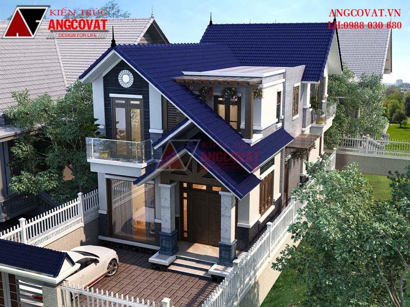 Mẫu 14: Thiết kế nhà biệt thự 2 tầng 2 mặt tiền có ban công rộng và mái dốc tiện nghi