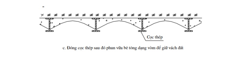 Phương án thi công đóng cọc thép sau đó phun vữa bê tông dạng vòm để giữ đất áp dụng khi đất rời, không có nước ngầm hay đất dẻo