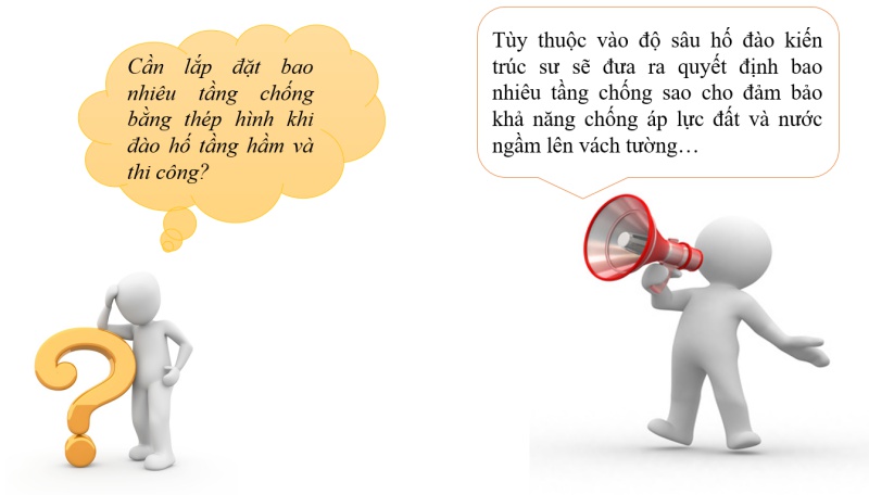 Trong quá trình đào đất và thi công tầng hầm, cần thiết phải lắp bao nhiêu tầng hệ thống chống bằng thép hình hay hệ thống neo?- Việc lắp đặt bao nhiêu hệ tầng chống tùy thuộc vào độ sâu của đáy đào và trạng thái đất (đất yếu hay đất tốt) để quyết định. Việc này nhằm đảm bảo khả năng chống lại áp lực đất và nước ngầm ở phía ngoài tác động lên vách tường tầng hầm sau này.