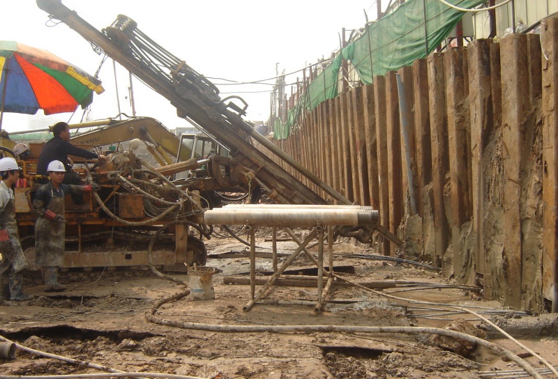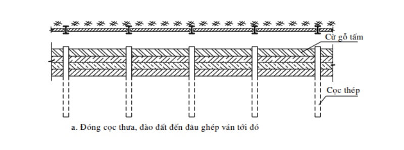 - Đóng cọc: Khoảng cách giữa các cọc khoảng từ 0,8-1,5m, thường là cọc thép hình (I hay H), ván gỗ. Phương pháp này được áp dụng khi hố không sâu, áp lực đất nhỏ, không có nước ngầm chảy mạnh. Gỗ và cọc sau khi thi công được thu hồi để sử dụng lại.