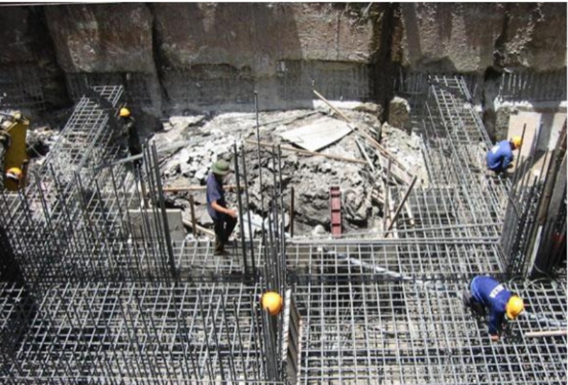 - Thông thường ở những vị trí liên kết giữa sàn tầng hầm và tường vây chúng ta đặt thép sẵn bên trong, khi thi công sàn thì chúng ta đập bỏ phần bê tông tường vây ra, bẻ quặt thép ra, nối với cốt thép sàn và đổ bê tông. Nhưng biện pháp này có một nhược điểm đó là việc bẻ thép ra vô như vậy sẽ ảnh hưởng tới cường độ của thép rất nhiều.