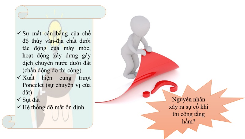 Biểu hiện và nguyên nhân xảy ra sự cố cần phòng ngừa khi lập biện pháp thi công tầng hầm?- Để trả lời thắc mắc này, các bạn có thể tham khảo thêm bài viết quản lý sự cố khi thi công tầng hầm theo phương pháp bottom-up. Có thể chỉ ra một vài nguyên nhân cơ bản dẫn đến sự cố, hư hỏng trong quá trình thi công cũng như sử dụng tầng hầm như các chấn động do thi công dẫn đến sự mất cân bằng của chế độ thủy văn, nước; sự xuất hiện của cung trượt poncelet để vào tầng hầm,... Từ những nguyên nhân này có thể gây ra các sự cố nứt gãy kết cấu, đứt đường ống, nghiêng lún nhà, sụt đất, đổ tường rào, sập đổ nhà.