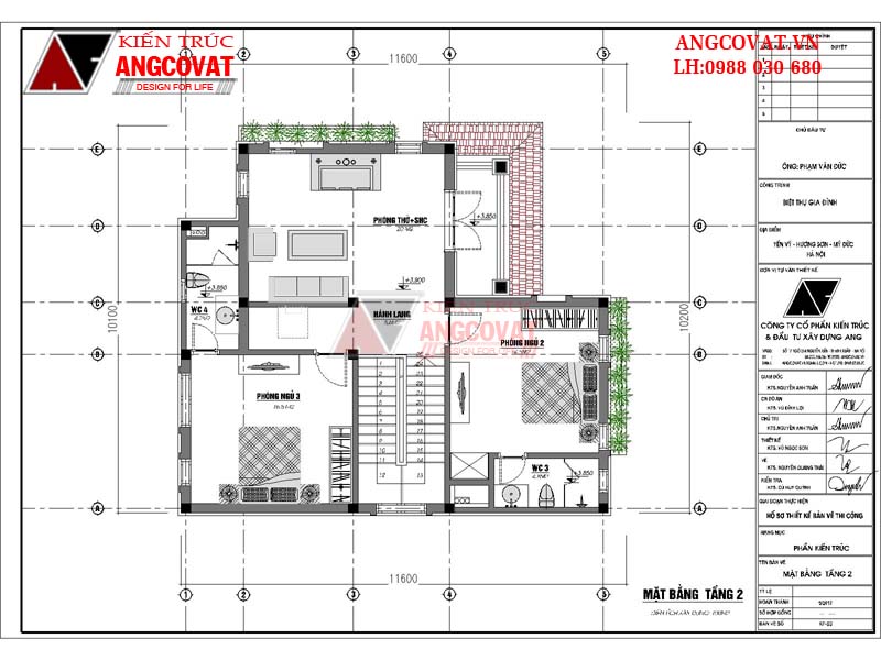 +) Tầng 2: Hành lang 5.6m2, Phòng thờ + SHC: 20m2, Phòng ngủ 2: 14.5m2, WC3: 4.8m2, Phòng ngủ 3: 16.5m2, WC4: 4.2m2