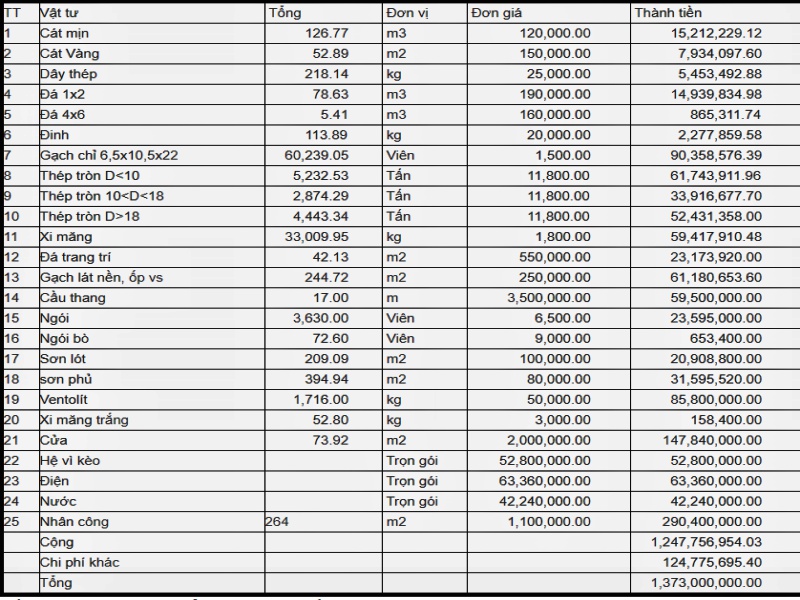 * Chi phí khác như đào móng, lấp móng, ép cọc, phát sinh thi công,.. được tính bằng 10-15% chi phí tổng.