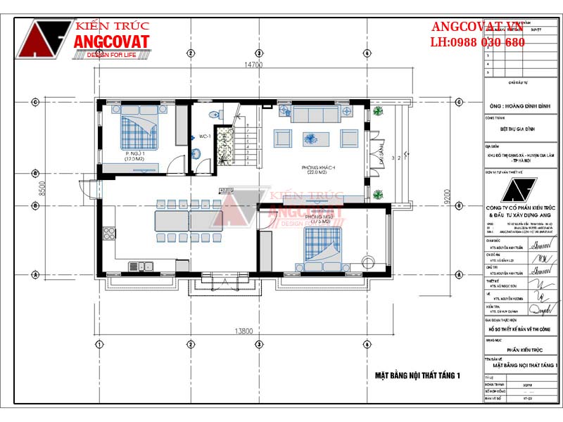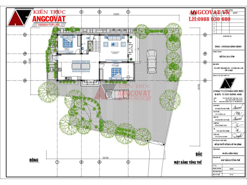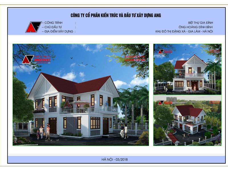 Thiết kế nhà 110m2 2 tầng do đội ngũ kiến trúc sư giàu kinh nghiệm của ANG thiết kế cho lô đất của gia đình ông Hoàng Đình Bình ở Đặng Xá, Gia Lâm. Lô đất kích thước 400m2 khá rộng rãi, bằng phẳng ở vùng ngoại ô Hà Nội, có lợi thế về cảnh quan chung quanh. Trên ô đất ấy, gia chủ mong muốn xây mới một ngôi nhà với nội dung như sau: