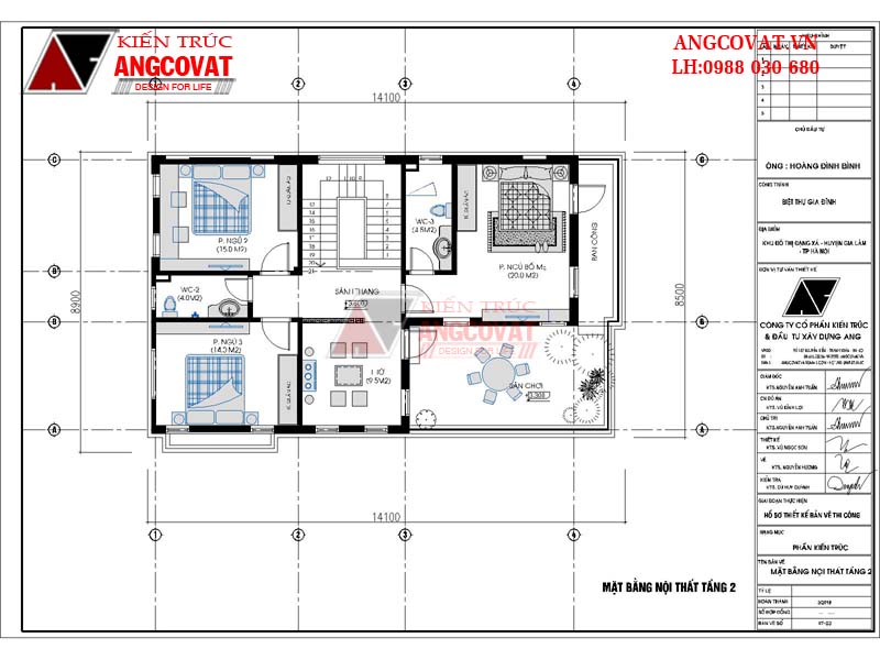 +) Tầng 2: Sảnh thang: 3.6m2, Phòng ngủ 2: 15m2, WC2: 4m2, Phòng ngủ 3: 14m2, Phòng ngủ bố mẹ:20m2,Sân chơi, Ban công.