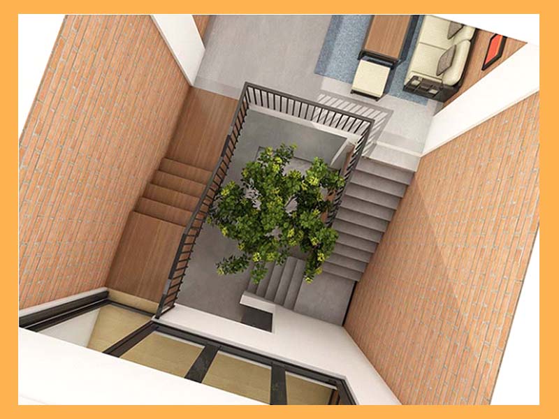 - Nhà 2 tầng lệch tạo không gian thông thoáng: Thông thường cầu thang trong nhà 2 tầng lệch sẽ được bố trí ở giữa và xung quanh là các phòng. Từ trên nhìn xuống ta sẽ thấy khu vực cầu thang như giếng trời giúp ánh sáng rọi xuống và lan tỏa đều khắp không gian. Những khe hở do sự chênh lệch giữa 2 tầng sẽ giúp cho không khí lưu thông dễ dàng, không gian trở nên thoáng mát hơn