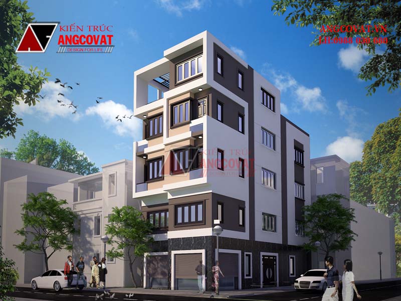Phối tone màu nâu cafe sang trọng kết hợp trắng tinh tế cho mẫu nhà phố kết hợp văn phòng cho thuê