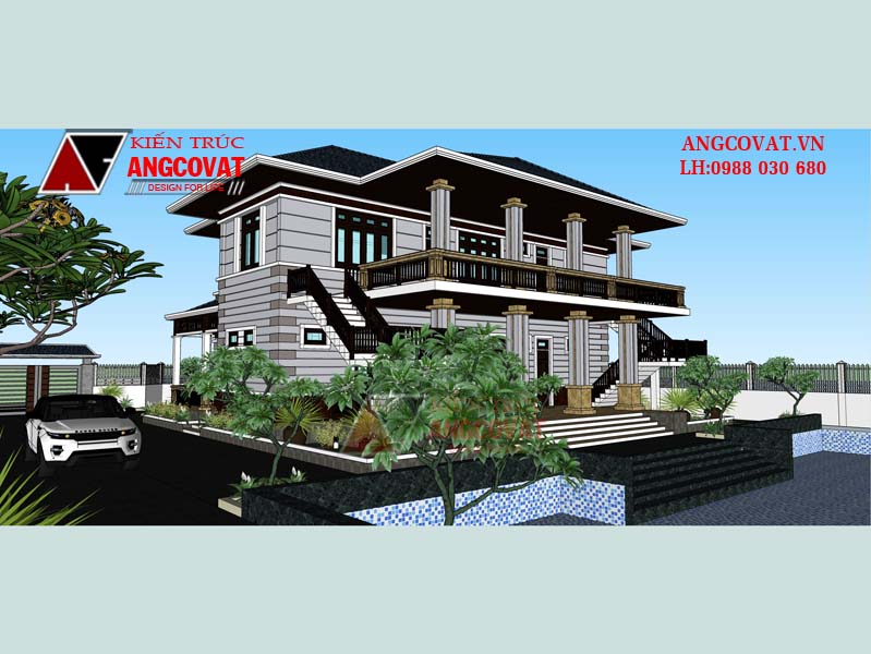 Một ngôi biệt thự đẹp đó chính là ngôi biệt thự đáp ứng được những yêu cầu về mặt thẩm mỹ và mặt công năng. Mẫu biệt thự 2 tầng diện tích 200m2 chính là mẫu biệt thự đẹp với chi phí hơn 2 tỷ đồng. Ông Dương Minh Doan qua lời giới thiệu của người thân đã tìm đến văn phòng tư vấn của Kiến trúc Angcovat để có thể gửi gắm những mong muốn của mình. Với số tiền lớn mà ông Doan đầu tư, ông muốn được sở hữu ngôi biệt thự lớn, vẻ ngoài phải sang trọng và nổi bật. Tuy nhiên, ông cũng muốn không gian mình sống phải thực sự xanh mát, thoáng đãng. Vì vậy, thiết kế nhà vườn 2 tầng chính là một sự lựa chọn phù hợp. Sau khi kí kết hợp đồng, chốt phương án làm việc với kiến trúc sư, ông Doan đã mời KTS về Hưng Yên khảo sát hiện trạng. Khu đất của ông rộng hơn 1700m2, dành 200m2 để xây dựng nhà ở, không gian còn lại ông Doan muốn xây thêm một hồ nước điều hòa không khí. Đây là một ý tưởng tuyệt vời, nó phù hợp với điều kiện khí hậu nóng ẩm và ngày càng biến đổi ở khu vực miền Bắc. Ngôi biệt thự 2 tầng mái thái ấn tượng này đã tạo thiện cảm cho người nhìn ngay từ lần đầu tiên. Thu hút ở vẻ ngoài đồ sộ và lôi cuốn ở nội thất bên trong.