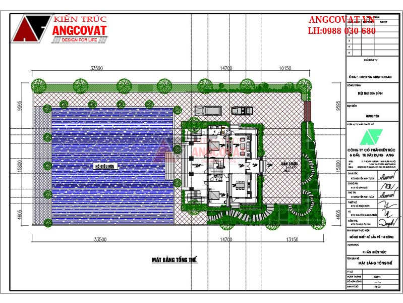 Với khu đất hình chữ nhật khá vuông vắn khoảng 200m2, chúng tôi đã phân chia mặt bằng khá cân xứng. Diện tích nhà ở và hồ nước sau nhà có diện tích tương đương nhau để tạo sự hài hòa. Từ cổng đi vào là mặt sân khá rộng để có thể đỗ xe và các phương tiện đi lại khác. Xung quanh ngôi biệt thự được trồng nhiều cây xanh và có các thảm cỏ nhằm mang đến một không gian thực sự xanh đẹp.