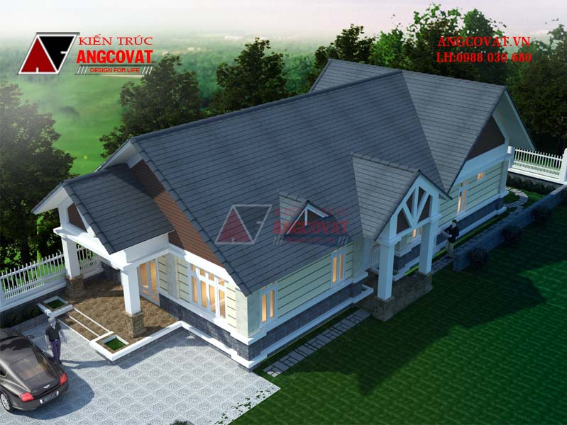 Nhìn vào bản phối cảnh mẫu nhà 1 tầng 2 phòng ngủ BT228036, kết cấu mái được kiến trúc sư Vương Văn Quân sử dụng là thiết kế mái thái hình chữ A vô cùng đẹp với nhiều mái phụ nhỏ theo các hướng khác nhau vừa tạo sự cân đối vừa tạo sự thanh thoát cho ngôi nhà. Dáng mái có độ dốc vừa phải đảm bảo quá trình thoát nước diễn ra nhanh chóng, chống thấm, chống dột hiệu quả. Thiết kế mái đua có tác dụng che chắn bảo vệ phần nội thất ở bên trong.