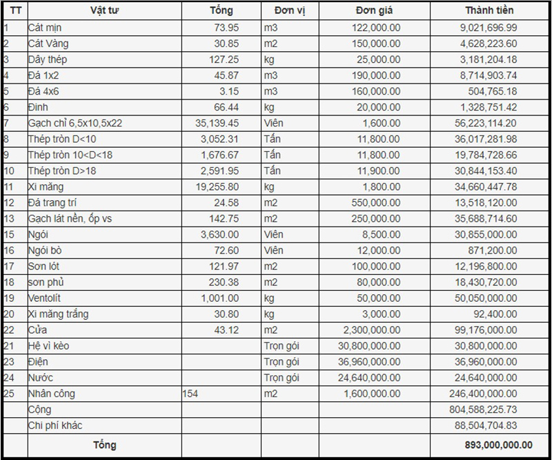 * Trường hợp chỉ làm vì kèo lợp ngói, đóng trần chi phí là: 803.700.000đ