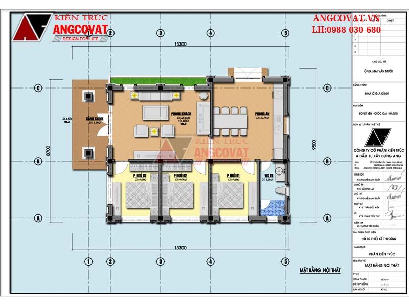 Qua tìm hiểu và được giới thiệu tư bạn bè gia đình anh Mai Văn Mười ở Quốc Oai – Hà Nội, đã tin tưởng lựa chọn kiến trúc Angcovat. Cùng với sự tư vấn của kiến trúc sư có kinh nghiệm trên 10 năm, anh Mười đã chọn mẫu thiết kế nhà cấp 4 9x12m hiện đại để xây dựng cho căn nhà của mình. Từ đôi tay thiết kế tài hoa của kiến trúc sư của chúng tôi đã dựng lên bản vẽ xuất sắc với công năng sử dụng trên diện tích gần 120m2.
