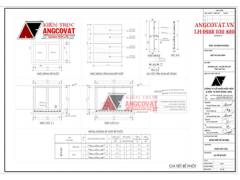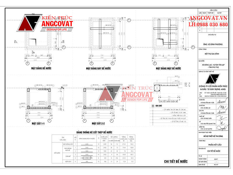 - Bản vẽ chi tiết bể phốt, bể nước ngầm: Đây là những chi tiết không thể thiếu trong các công trình nhà biệt thự 2 tầng. Vì đều xây dựng bằng bê tông cốt thép nên cần có các bản vẽ thể hiện mặt bằng, mặt cắt, bố trí thép của bể phốt, bể nước…