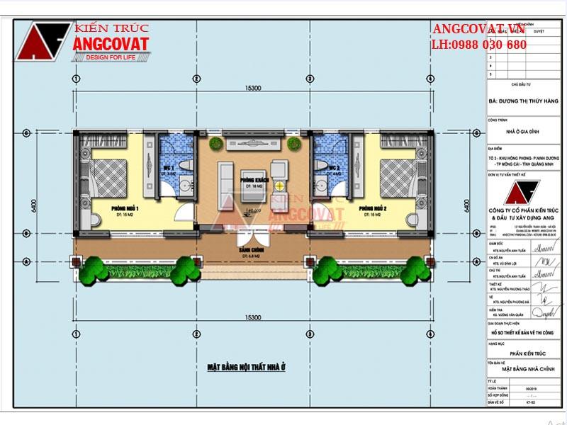 + Mặt bằng nội thất nhà ở: Sảnh chính: 6.8m2, Phòng khách: 18m2, Phòng ngủ 1: 15m2, WC1: 4m2, Phòng ngủ 2: 15m2, WC2: 4m2