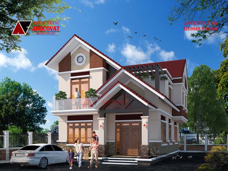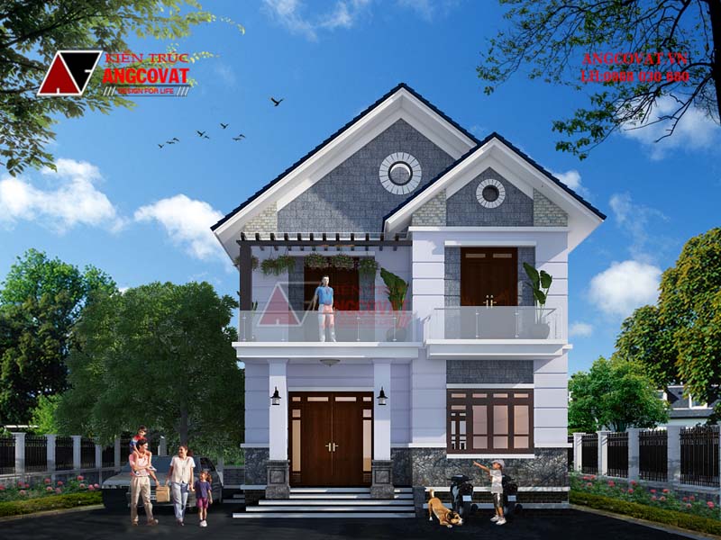 Tư vấn mẫu nhà biệt thự 2 tầng mặt tiền 9m 1 tum 100m2 mái thái rẻ đẹp BT105097