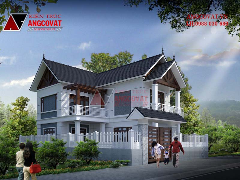 Công trình mẫu nhà biệt thự 2 tầng mặt tiền 9m này được xây dựng ở Phong Thổ - Lai Châu có mặt tiền 9m, chiều sâu 11,2m trong kích thước ô đất 20x35m. Ngôi nhà được xây dựng với diện tích nhà 80m2/ sàn cùng phối cảnh tone trắng ghi và thiết kế mái thái xanh ghi với thông số công năng bao gồm: