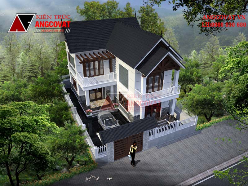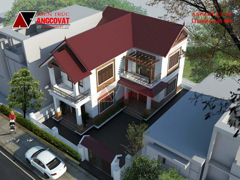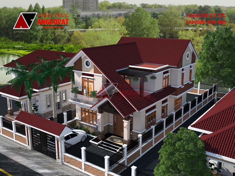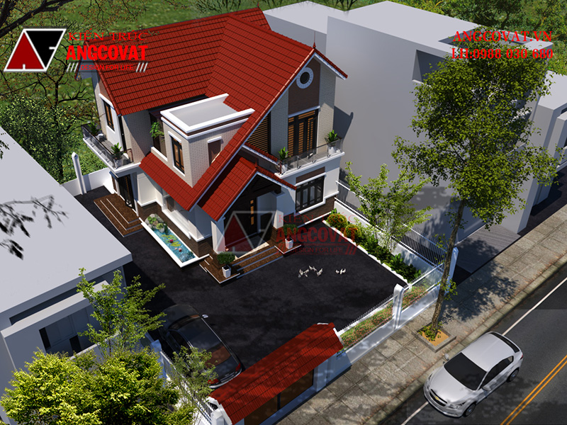 Hồ sơ thiết kế mẫu nhà biệt thự 2 tầng mặt tiền 9m, sâu 13m mái ngói đơn giản đầy đủ phối cảnh, mặt bằng BT223058