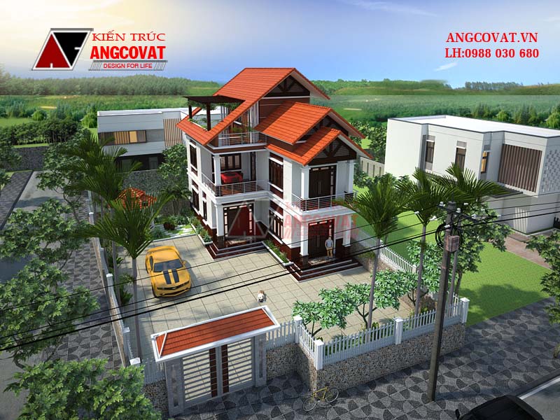 Hình ảnh phối cảnh, mặt bằng mẫu nhà biệt thự 2 tầng mặt tiền 9m mái thái ở quê BT212018