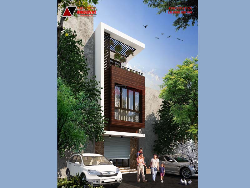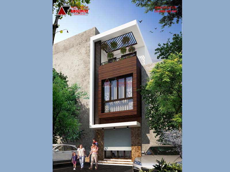 Điểm nhấn của kiến trúc này là mảng tường ốp sơn màu nâu gỗ cùng với các thanh lam giả gỗ nối tiếp nhau lên tới sân thượng vừa là chỗ trang trí vừa là nơi để trồng các loại dây leo, treo giỏ lan cây cảnh,..