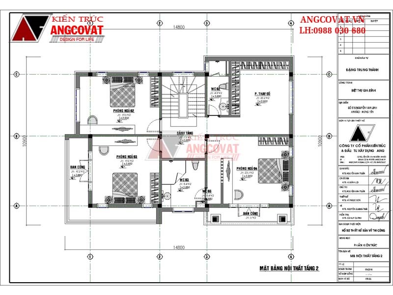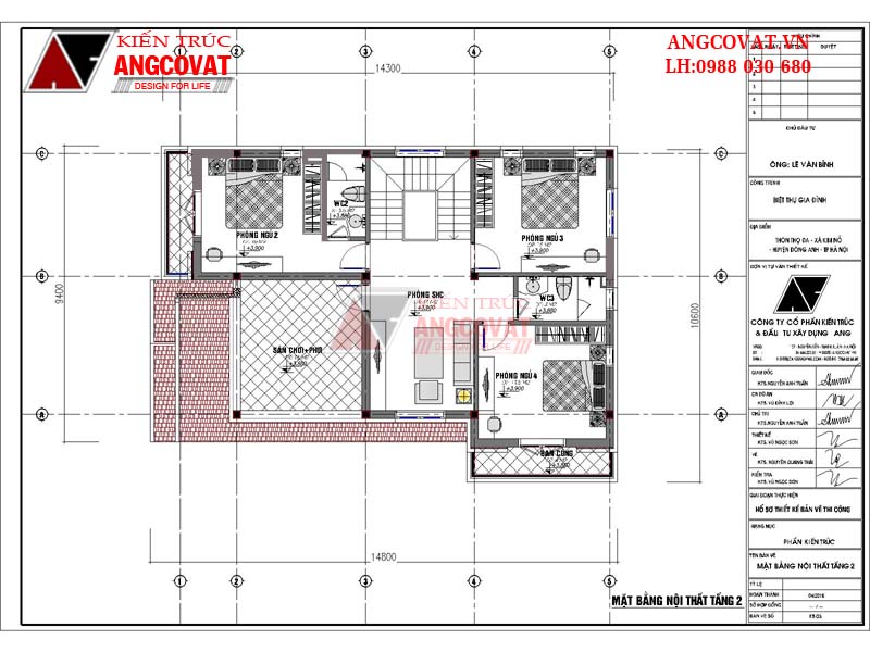 +) Tầng 2: Phòng Sinh hoạt chung: 14m2, Phòng ngủ 2: 16m2, WC2: 3.5m2, WC3: 4m2, Phòng ngủ 3: 15m2, Phòng ngủ 4: 14.5m2, ban công: 4m2.