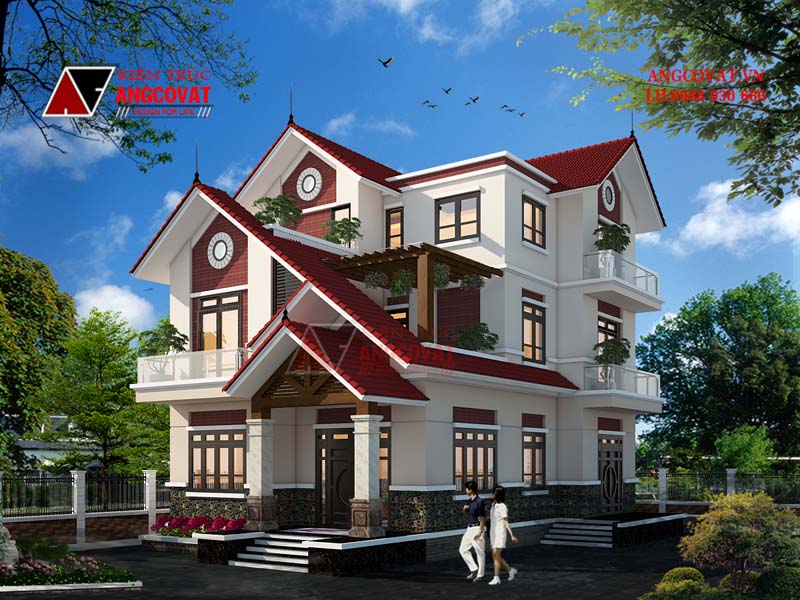 Hình ảnh phối cảnh: Các mẫu thiết kế biệt thự nhà vườn 3 tầng 2 mặt tiền mái thái đẹp