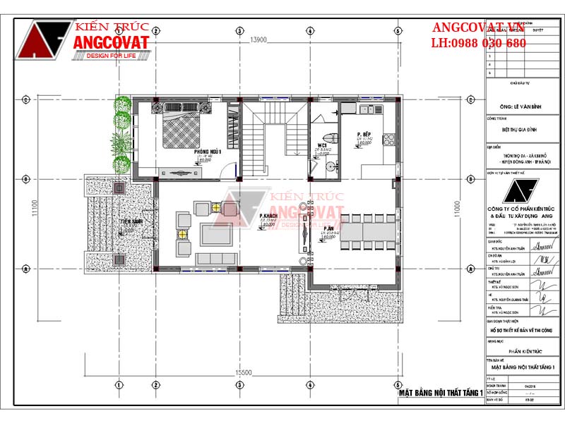 +) Tầng 1: Phòng khách 32m2, Gara ô tô: 27.5m2, Phòng bếp ăn: 20m2, WC1: 5m2, Phòng ngủ 1: 19.5m2.