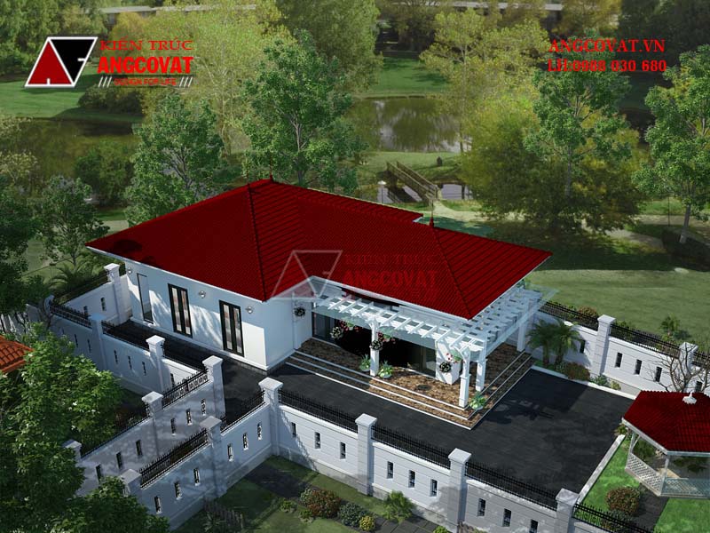 Màu sắc của mái ngói được lựa chọn là màu ngói đỏ. Đây là một trong những gam màu gợi cho biết bao thế hệ nhớ về kiến trúc nhà cấp 4 mái ngói đỏ tươi, phổ biến ở vùng đồng bằng bắc bộ trước đây. Rất nhiều công trình biệt thự nhà vườn sử dụng gam màu giản dị, mộc mạc và dân dã, không gian và dễ dàng tạo được sự nổi bật cũng như thu hút trong tổng thể không gian xây dựng. Đối nghịch với gam màu đỏ tươi - đại diện cho tone màu nóng là một gam màu trắng - trung tính. Sự đối nghịch không tạo ra sự rời rạc mà ngược lại đó là sự nổi bật và làm nền cho nhau, đan xen, liên kết thành 1 khối tổng thể không tách rời nhau.
