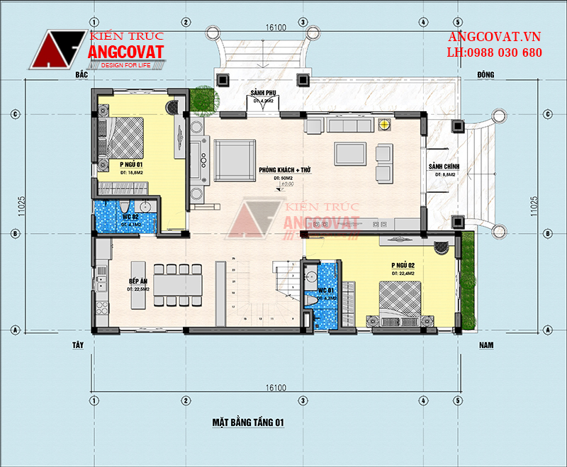 Thông số công năng tầng 1: sảnh chính 8,8m2; phòng khách + phòng thờ 50m2; sảnh phụ 4,2m2; phòng bếp + ăn 22,5m2; phòn ngủ 1: 18,8m2; wc1: 4,1m2; phòng ngủ 2: 22,4m2; wc1: 4,3m2;