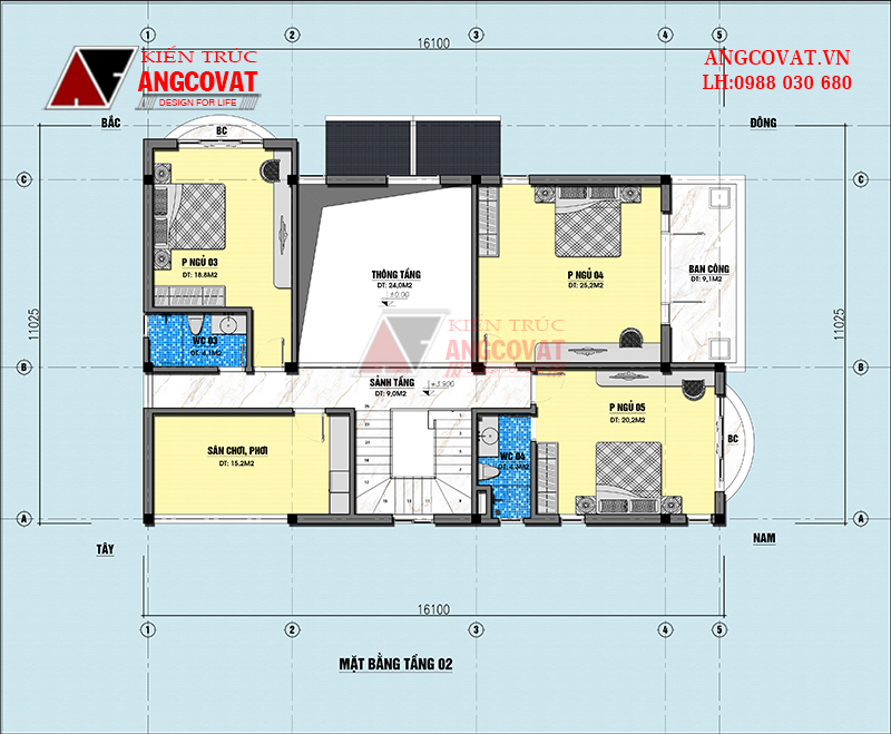 Công năng tầng 2: thông tầng 24m2; sảnh tầng 9m2; phòng ngủ 3: 18,8m2; wc3: 4,1m2; sân chơi phơi 15,2m2; phòng ngủ 4: 25,2m2; ban công 9,1m2; phòng ngủ 5: 20,2m2; wc4: 4,3m2